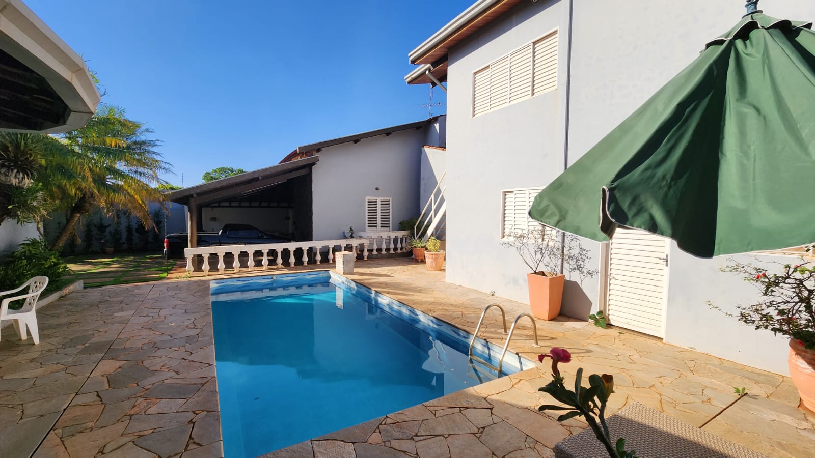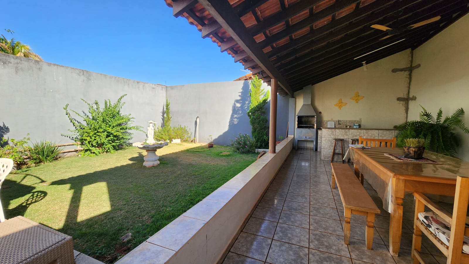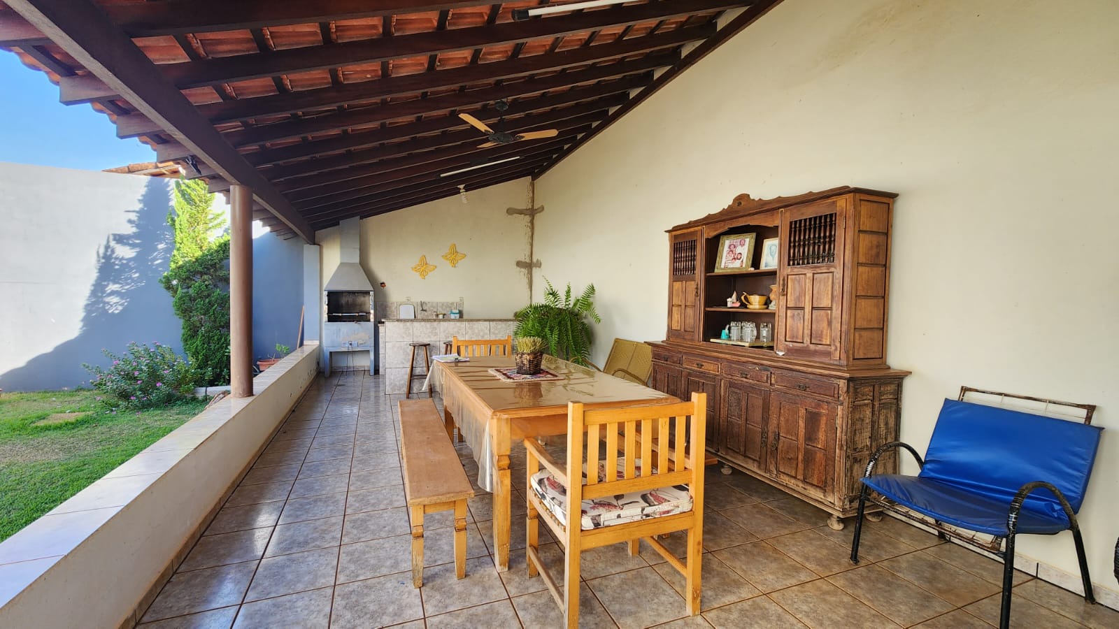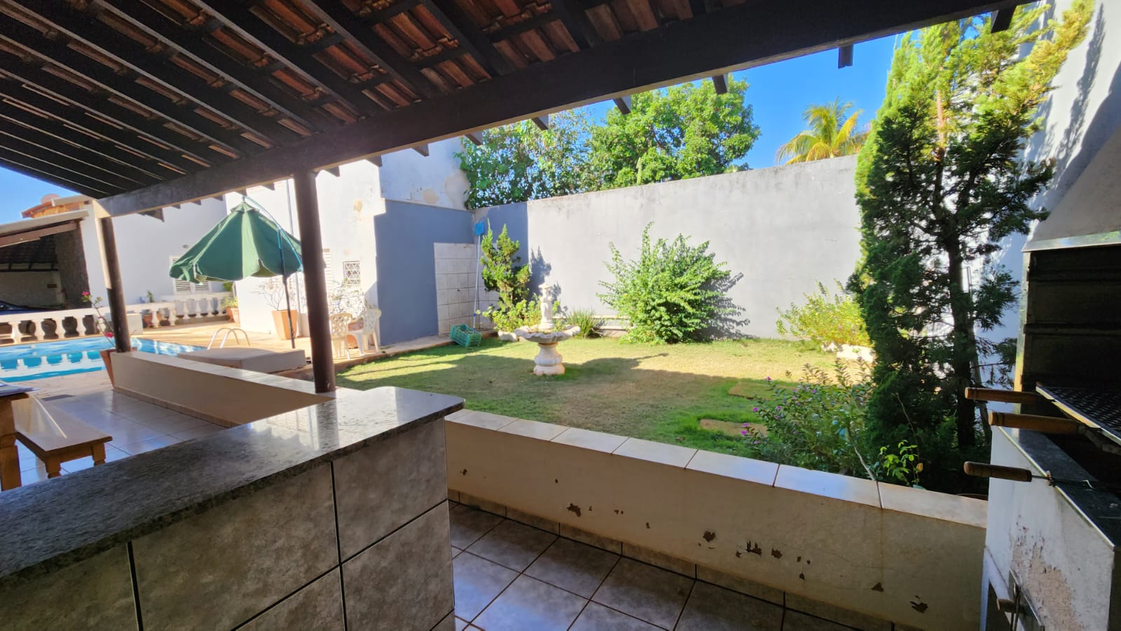 Descrição: 01 suíte c/ jardim, 02 dormitórios, 01 wc social c/ armários, sala de TV, sala de jantar, laje, piso frio, cozinha c/ piso e forro PVC, área de serviço coberta, corredor lateral, área lazer c/ piscina, churrasqueira, jardins, galpão, despejo.