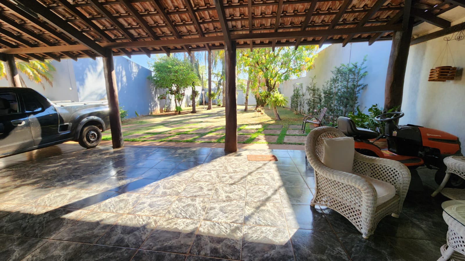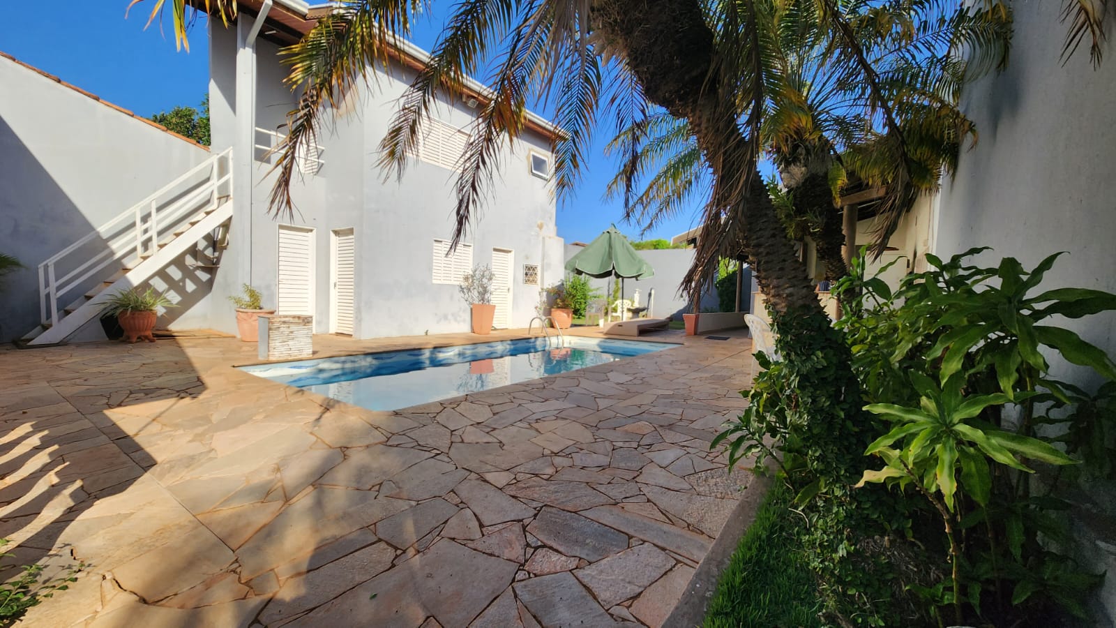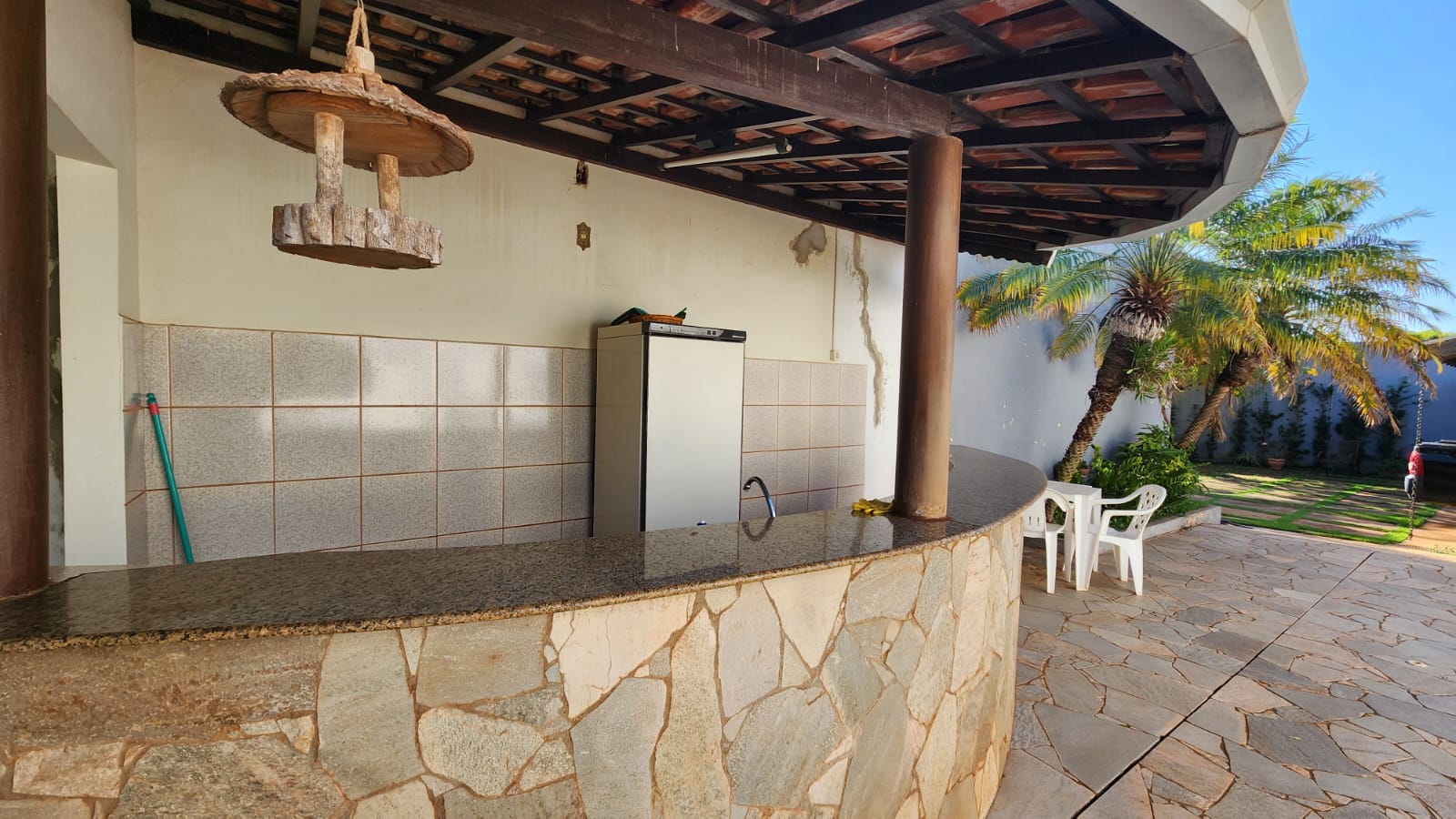 Descrição: 01 suíte c/ jardim, 02 dormitórios, 01 wc social c/ armários, sala de TV, sala de jantar, laje, piso frio, cozinha c/ piso e forro PVC, área de serviço coberta, corredor lateral, área lazer c/ piscina, churrasqueira, jardins, galpão, despejo.