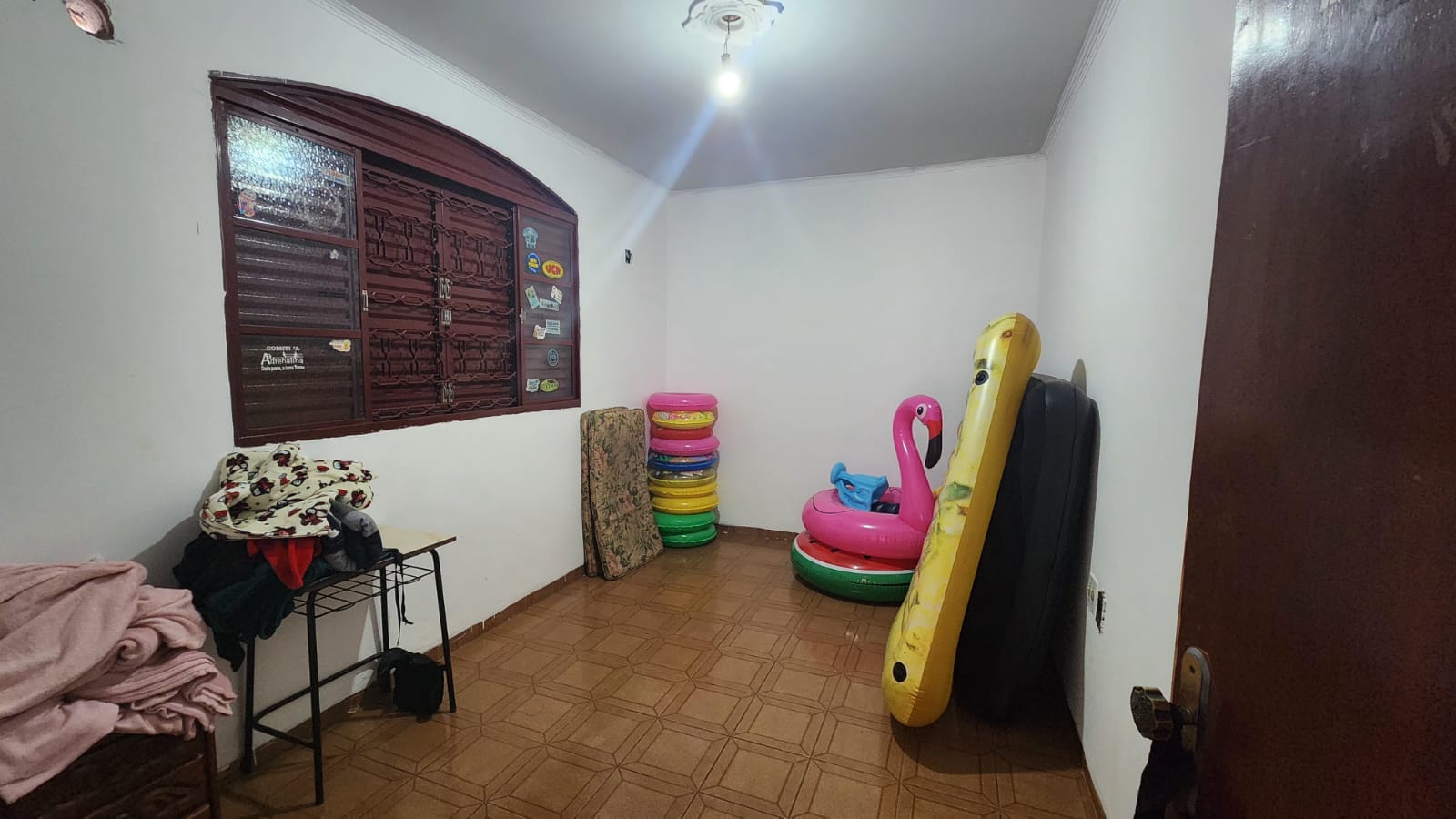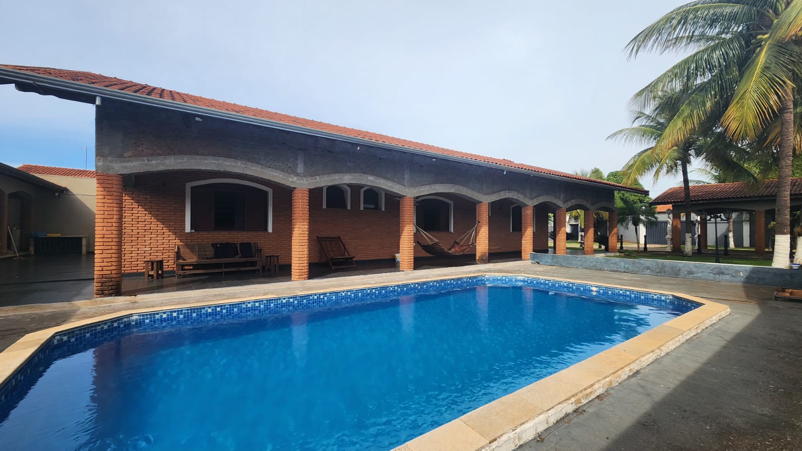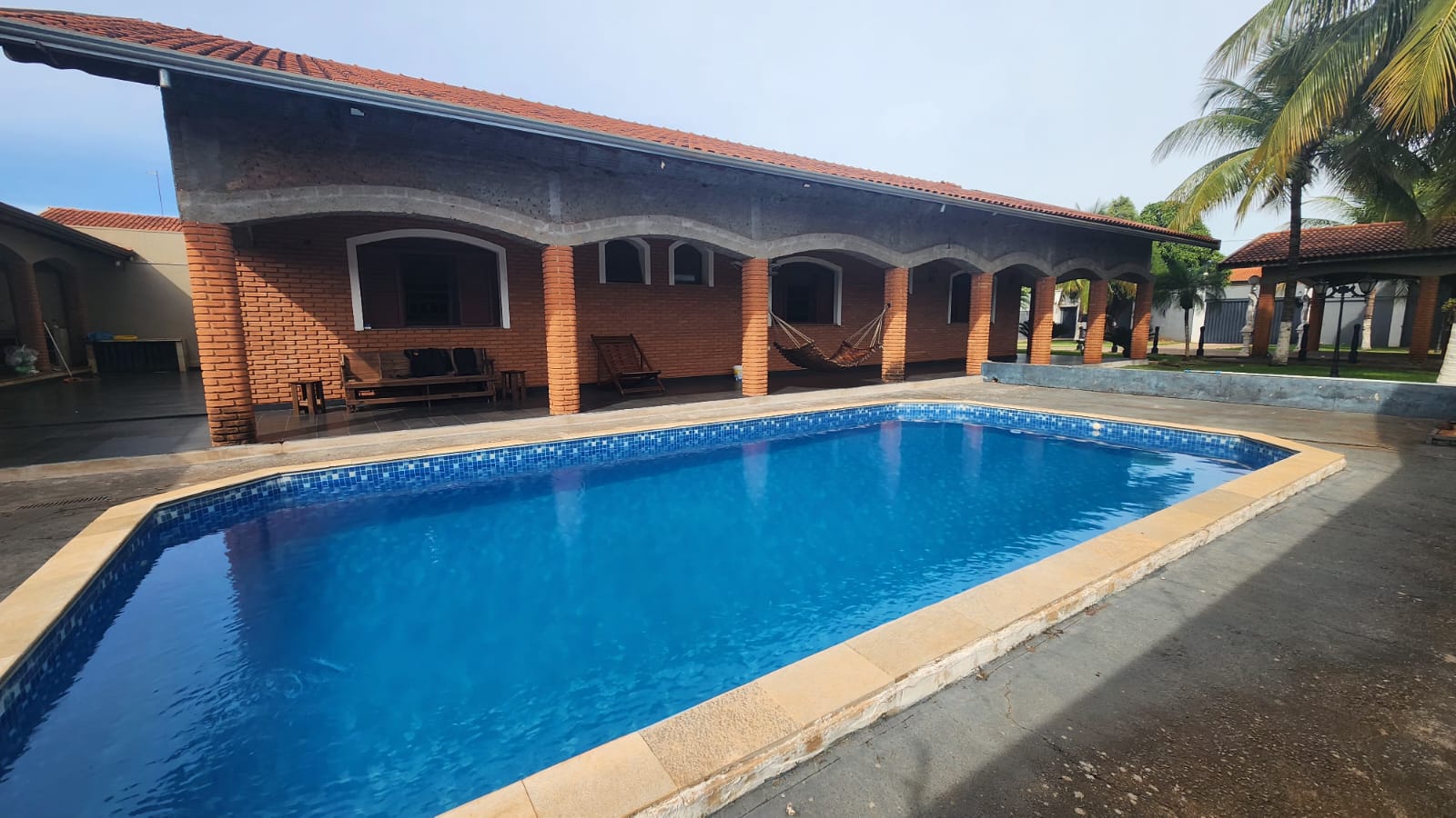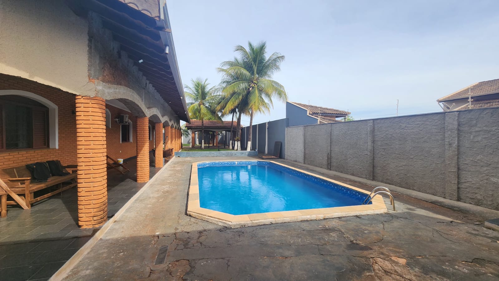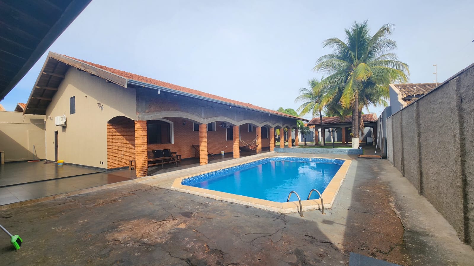 Fundos: 03 dormitórios, wc social, área de lazer c/ piscina, garagem para vários carros, piso frio, laje.