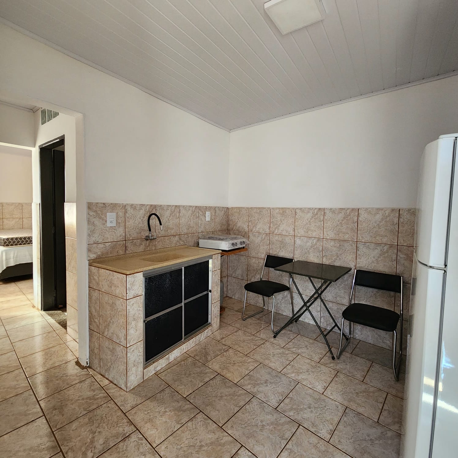 Fundos: 01 dormitório, 01 wc social, cozinha, forro p.v.c, piso frio, corredor lateral.
