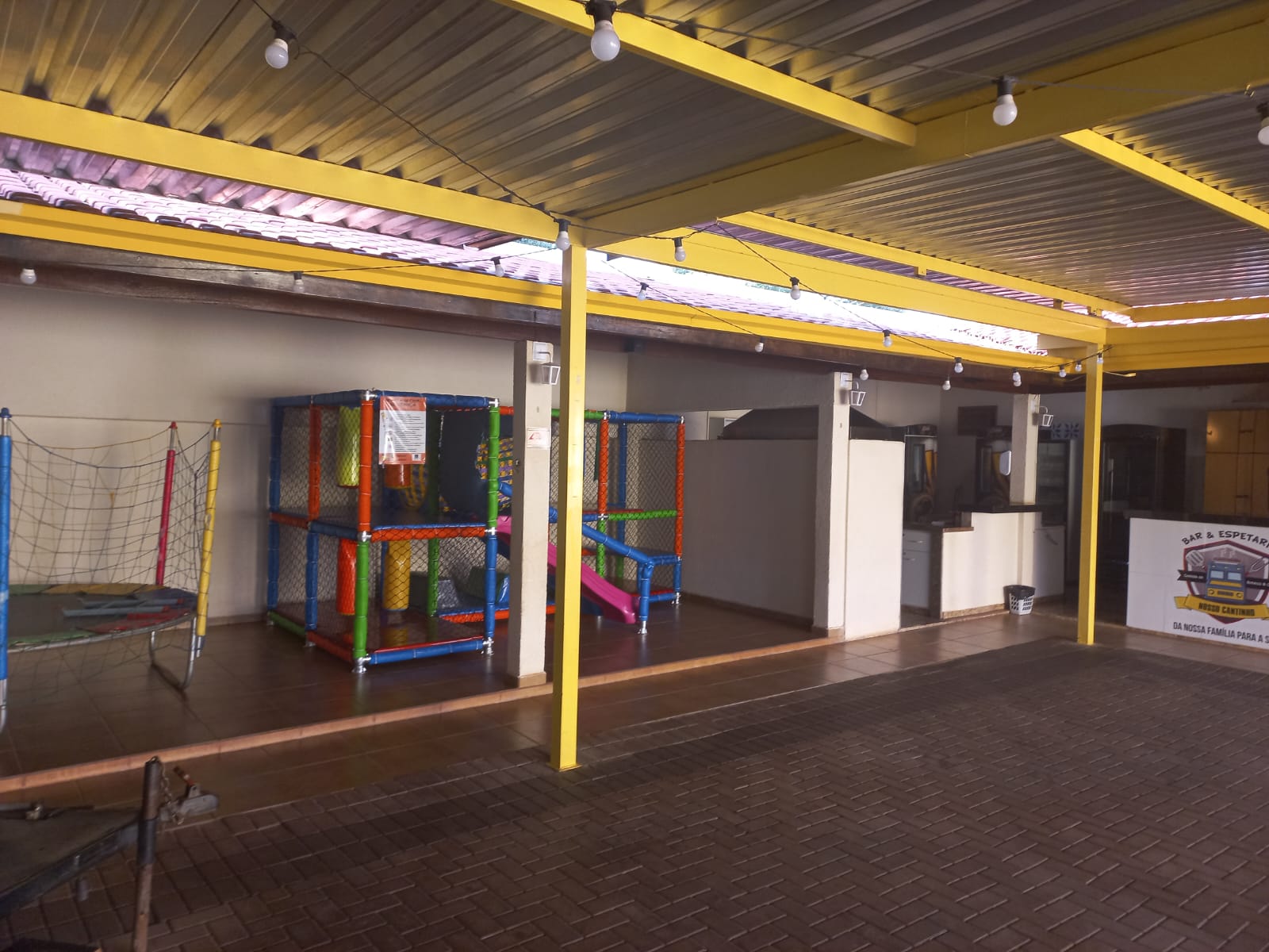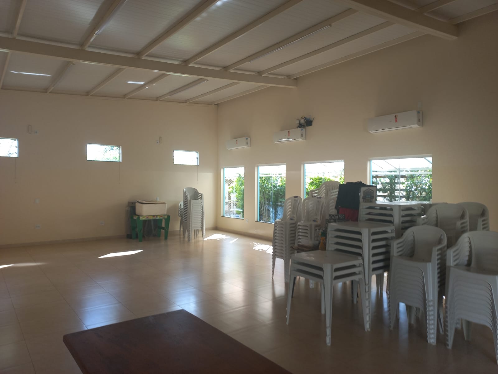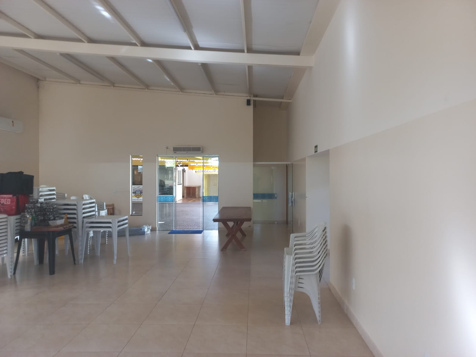 Descrição: Salão amplo, com 02 w.c. social, piso frio, ar condicionado, cozinha, escritório, hall de entrada, área externa com depósito, varanda do espaço kids, varanda, w.c. social, cobertura móvel do pátio.