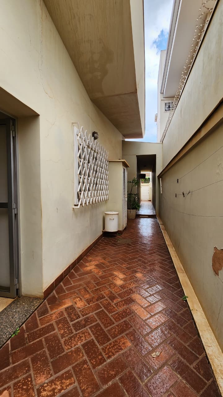 Corredor lateral, área de lazer com churrasqueira, pia, balcão, piscina.