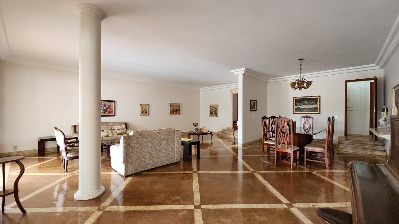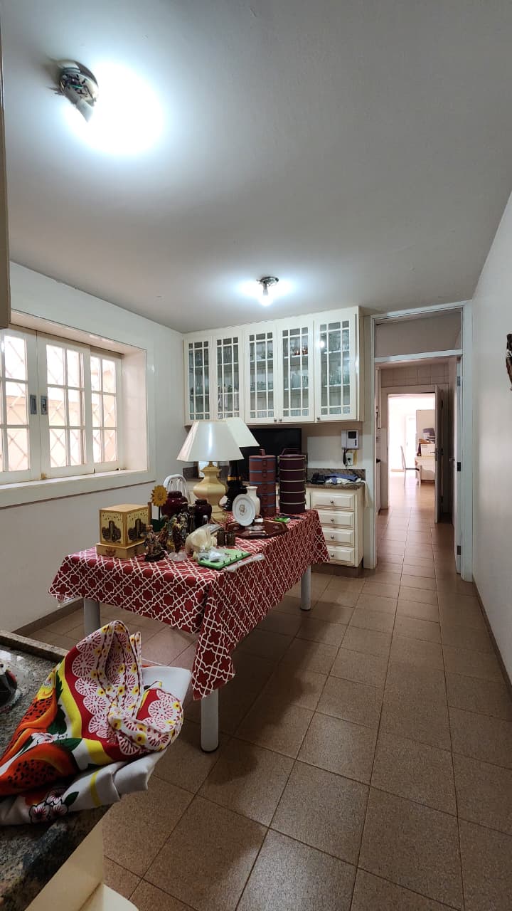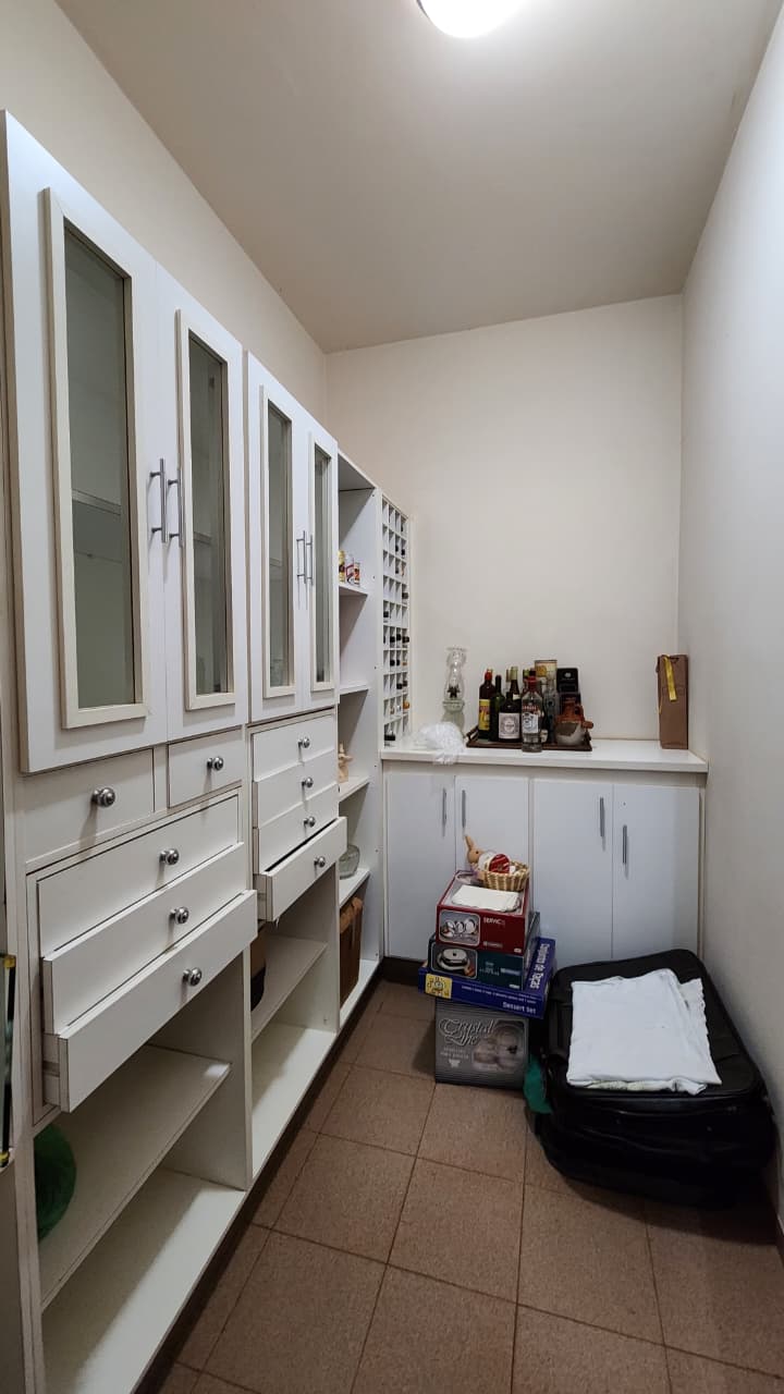 Sala ampla, closet de louça, sala de jantar com armários.