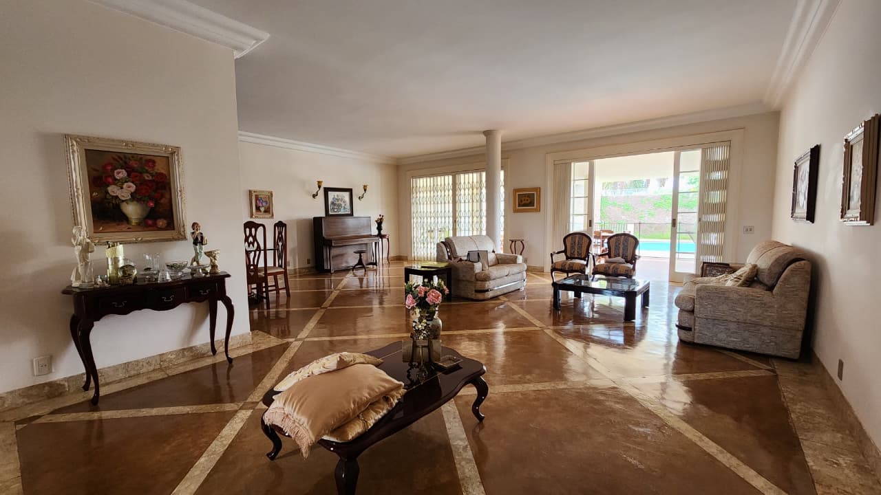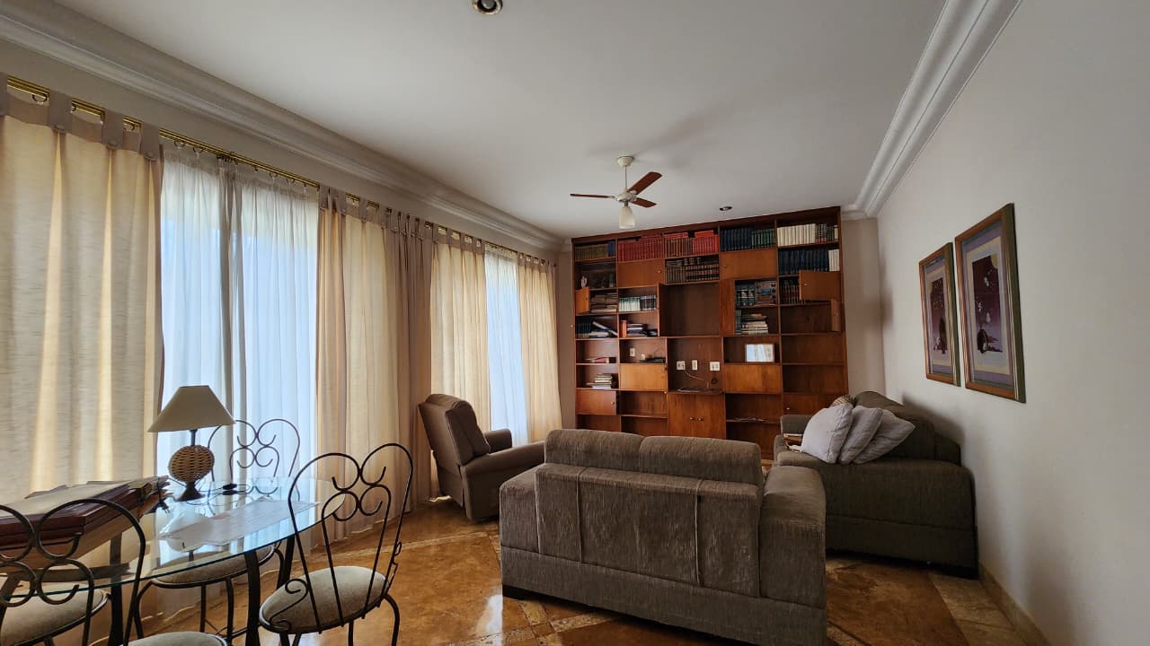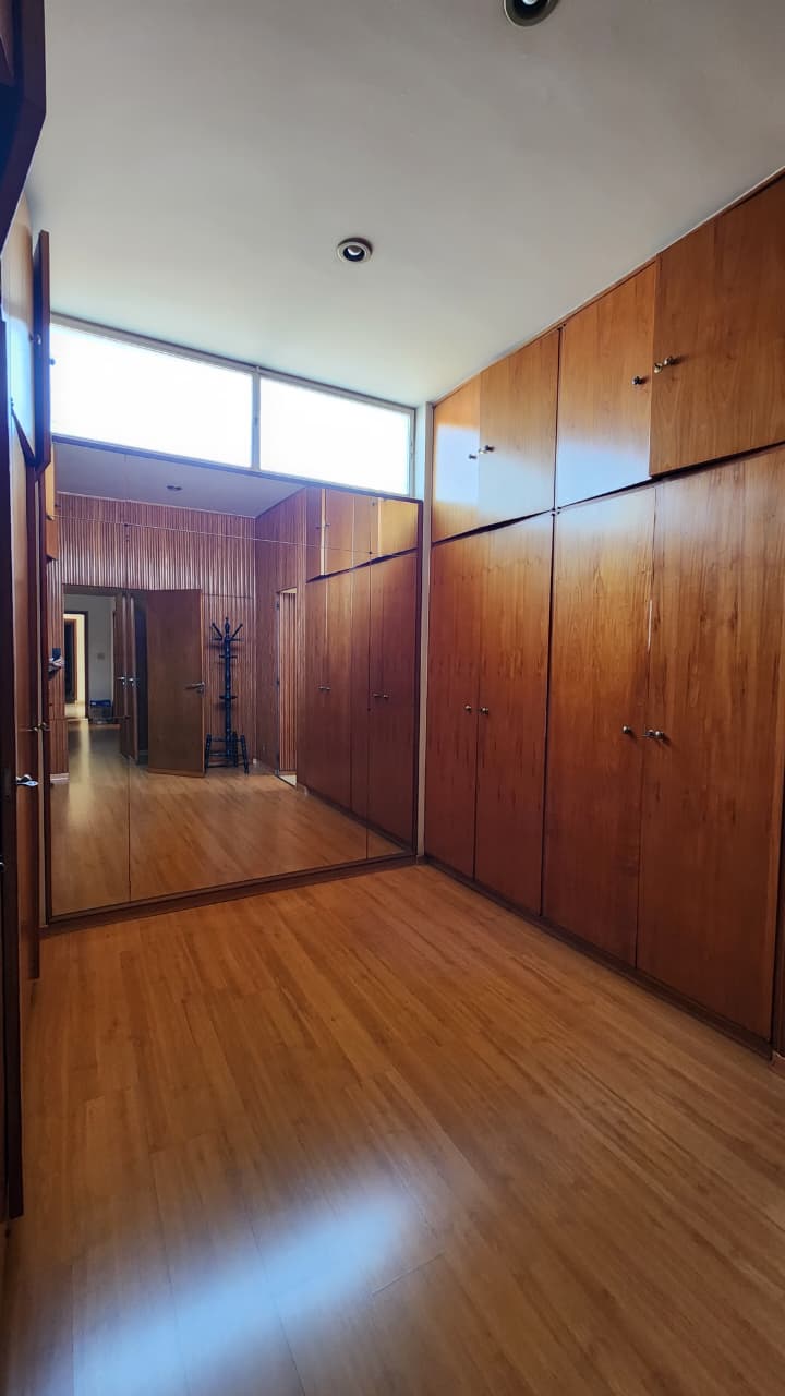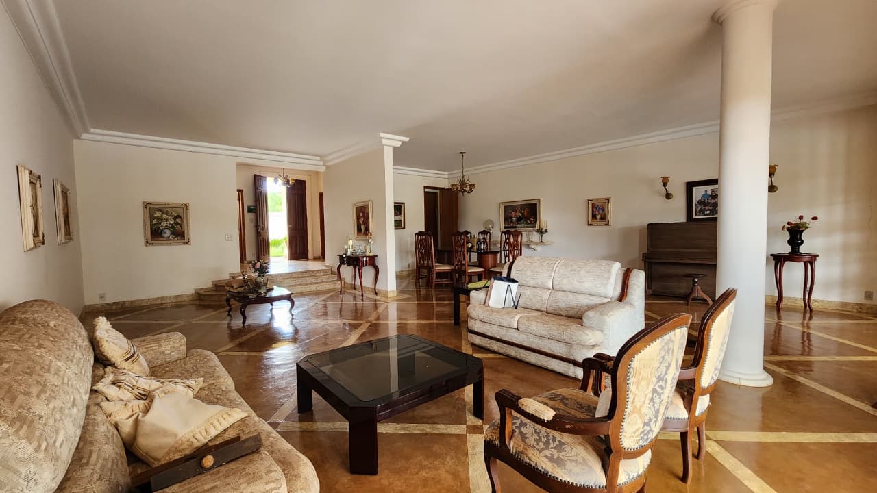 Sala ampla, closet de louça, sala de jantar com armários.