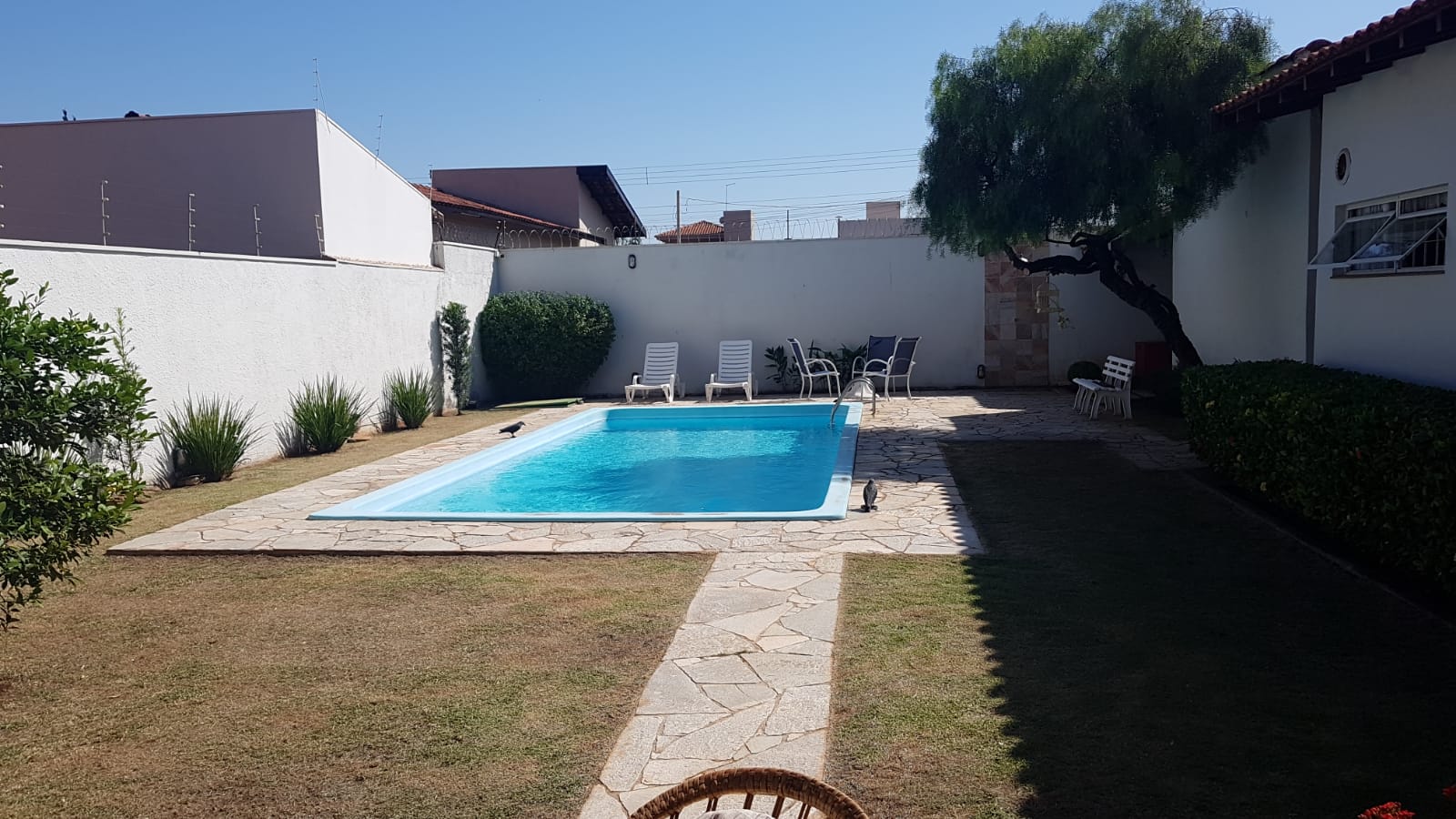Descrição: 01 suite c/ ar condicionado e clooset, 03 dormitórios c/ ar condicionado e guarda roupa embutido, sala de visita ampla e c/ lavabo e ar condicionado, sala de estar, sala de jantar, cozinha c/ armários dispensa. Fundos: 01 suite, área de lazer c/ piscina, fogão a lenha, churrasqueira, jardins e área de despejo, área de serviço coberta, corredor lateral, garagem para 04 carros, concertina, câmeras e portão eletrônico.